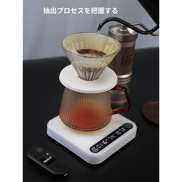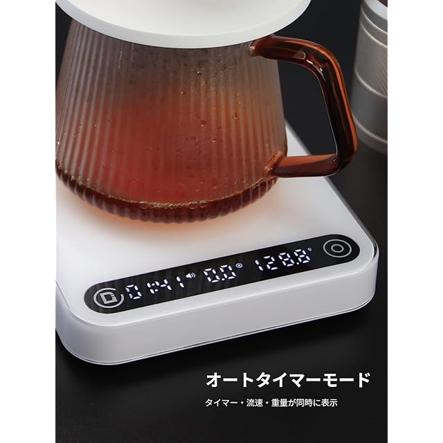【注ぐと自動でタイマー機能】コーヒーを淹れるための自動でタイマー機能を搭載。手動でスタートする必要はありません。お湯を注ぎ始めると、その同時にお湯を注ぐスピード、タイマー計時と計量が自動開始され、リアルタイムにデータをトラッキングします。計量物を外すと、自動に計時などが中止され、その時のデータを表示します。