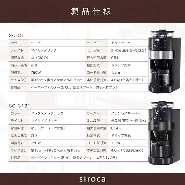 主な機能 手間なく挽きたての香り高いコーヒーが楽しめる、ミル内蔵『全自動』コーヒーメーカー。 香味や風味を損なう摩擦熱が少なく豆を均一に挽ける高精度の『コーン式ミル』を採用。 マイルドとリッチの2種類から気分に合わせて『テイスト選択』。 粗挽きから細挽きまでお好みで設定できる『ミル粒度無段階調整』。 豆本来のおいしさをしっかり引き出すようプログラムされた『蒸らし機能』。 約100gまで入る豆容器を搭載。杯数に応じて豆の量を『自動計量』。 お好みのスタイルで楽しめる『コーヒー豆/粉 両対応』。 お好みの時間に自動で挽きたてコーヒーを淹れられる『タイマー予約機能』。 おいしい温度をキープ『30分までの保温機能』※SC-C111のみ。 保温性に優れる『真空二重ステンレスサーバー』※SC-C121のみ。 水を注ぐのも丸洗いもラクラクな『脱着可能給水タンク』。 カートに戻る 製品仕様 製品名 コーン式全自動コーヒーメーカー SC-C111/SC-C121 電源 交流 100V・50/60Hz 消費電力 750W 外形寸法(約) 幅16×奥行27×高さ39cm 本体重量(約) 4.0kg(付属品を除く) コード長(約) 1.2m 最大使用水量 0.54L 抽出方式 ドリップ方式 保温機能 SC-C111:30分間、SC-C121:サーバーで保温 蒸らし機能 あり ミル機能 細挽き~粗挽き (無段階調節可能) テイスト選択 マイルド/リッチ タイマー予約機能 あり 豆自動計量 あり サーバー SC-C111:ガラスサーバー SC-C121:真空二重ステンレスサーバー(タングステンブラック) フィルター ペーパーフィルター セット内容 本体、ペーパーフィルター(5枚)、計量スプーン、お手入れブラシ、取扱説明書(書) ご購入前のよくあるご質問 製品ページ