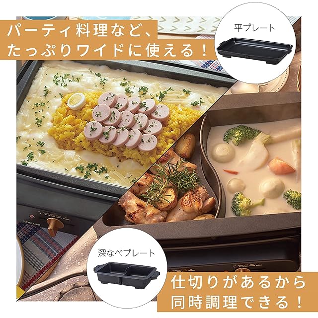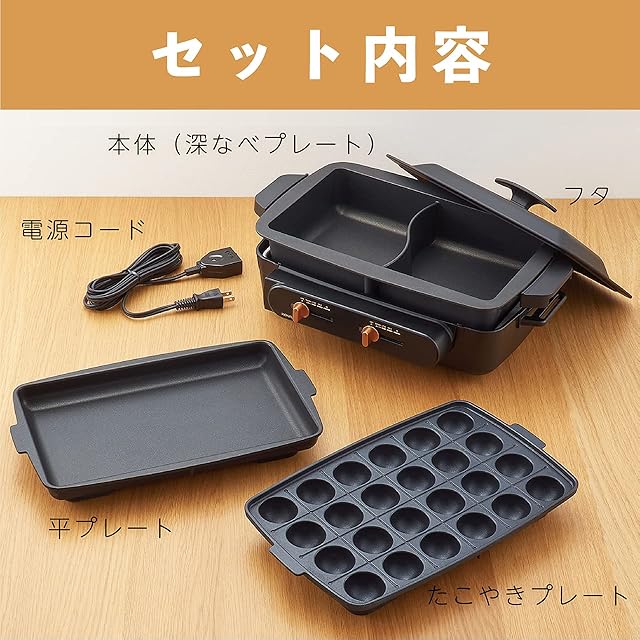 選べる3種類の鍋&プレート(仕切り深なべ、平プレート、たこ焼きプレート)