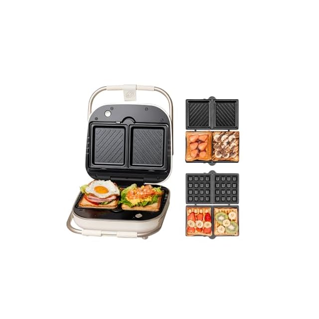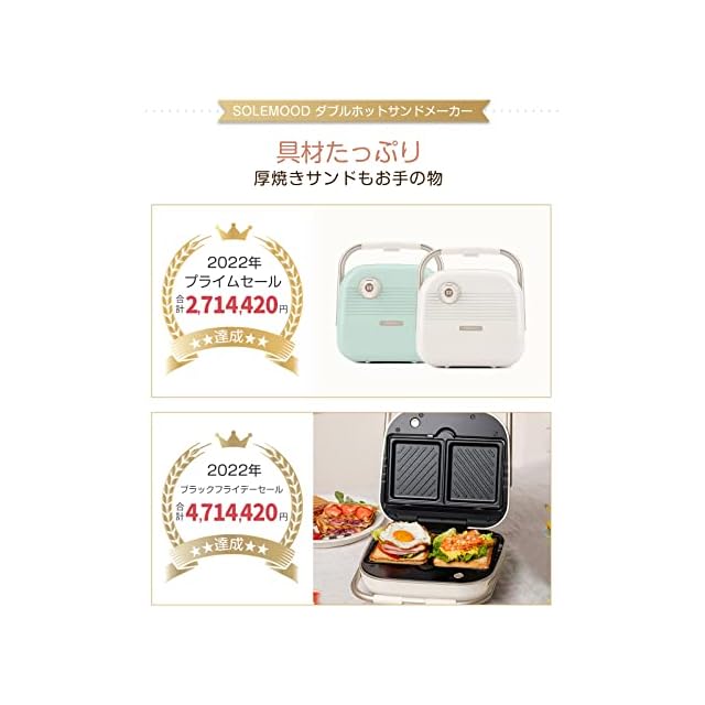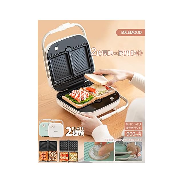 SOLEMOOD ホットサンドメーカー 耳まで焼ける 電気 ワッフルメーカー 着脱式 コンパクト マルチサンドイッチ 厚焼 ダブル 両面 プレート2種類 ホットサンドマシン ワッフルプレート付き 丸洗い お手入れ簡単 新生活 家族 ポータブル (アイボリー)