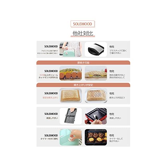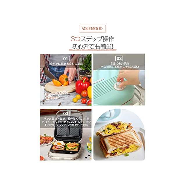 【食パン耳まで美味しく・話題の萌え断】パンの耳が苦手で、わざわざ切り落としているでしょう?一度、「SOLEMOODホットサンドメーカー」で作ったホットサンドをお試しください! しっかりとプレスし、耳の部分もこんがりカリっと焼き上げるので、きっとあなたも食パンの耳が好きになります。最大5cmの厚さの、パンの耳までサクサクに焼き上げた美味しいい厚焼きサンドが作れます。(調理する食材の厚さは5cmを超えないようにご注意ください)