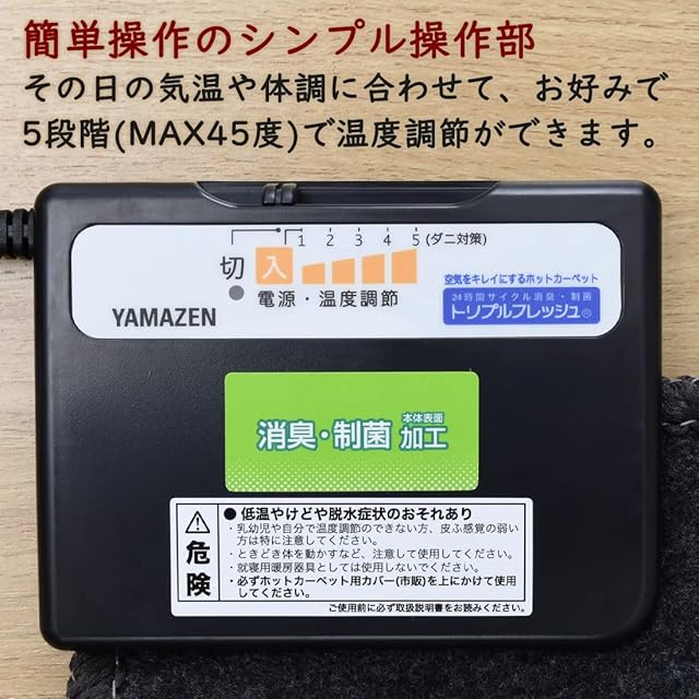 【温度調節】5段階での温度調節が可能なので、その日の気温などに合わせてお好みで設定してください。操作部は分かりやすいシンプルデザインなので、どなたでも気軽にお使いいただけます。
