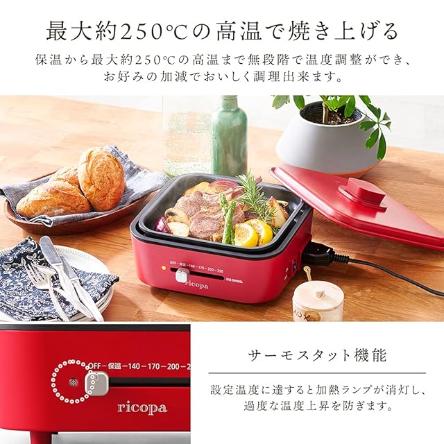 アイリスオーヤマ ホットプレート グリル鍋 2枚プレート (平面プレート 深なべプレート) サーモスタット機能 ricopa レッド IGU-PR2-R