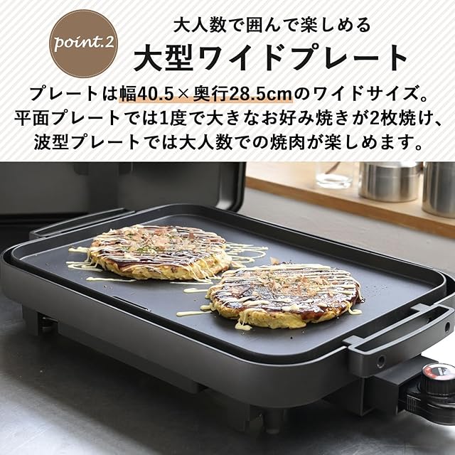 【大人数で使える大型プレート】プレート寸法は40.5×28.5cmのワイドサイズ。平面プレートでは大きなお好み焼きが2枚焼け、波型プレートでは大人数での焼肉も問題ありません。ご家族や友人と囲んで様々なプレート料理が楽しめます。