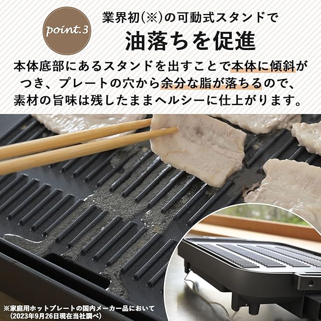 【業界初(※)の可動式スタンド】本体底部にあるスタンドを出すことで本体に傾斜がつき、プレートの穴から余分な脂が落ちるので、素材の旨味は残してヘルシーに焼肉やサムギョプサルが楽しめます。※家庭用ホットプレートの国内メーカー品において(2023年9月26日現在当社調べ)。
