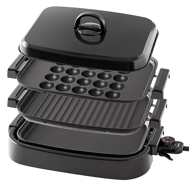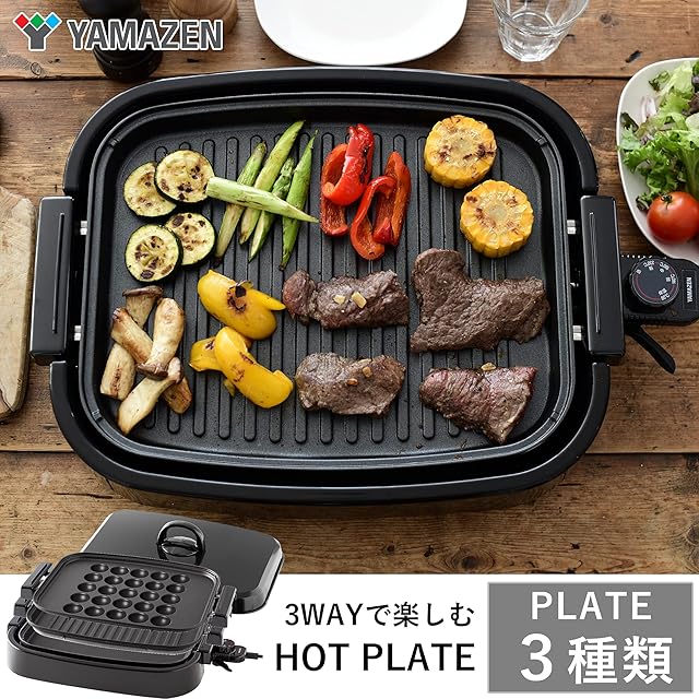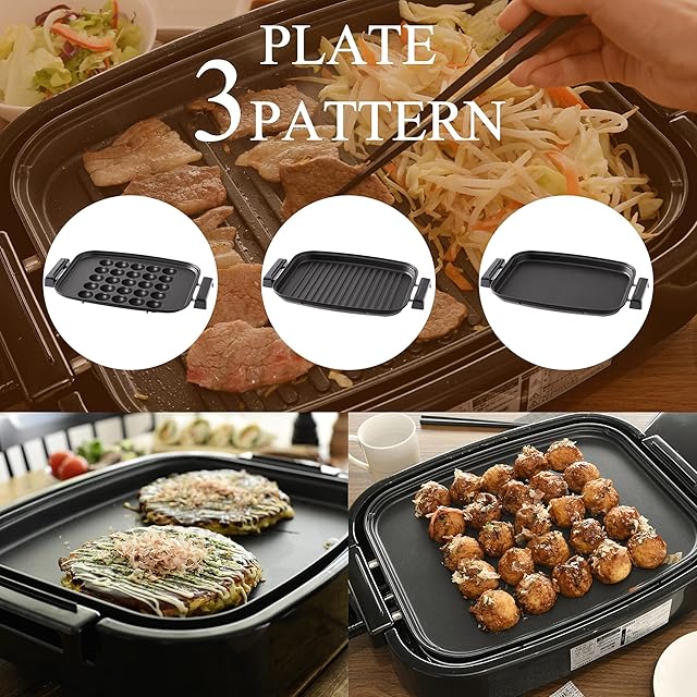 【3WAYで楽しむホットプレート】広々スペースの平面プレート・焼き肉に最適な波型プレート・一度に25個焼けるたこ焼きプレートで料理の幅が広がる。