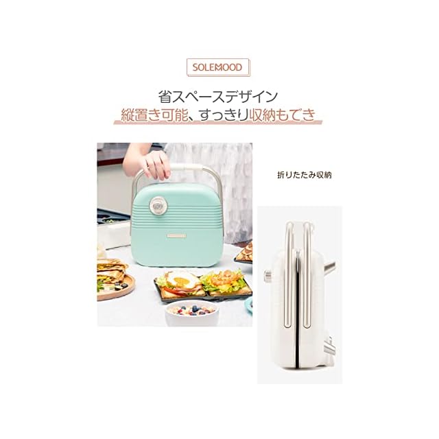 SOLEMOOD ホットサンドメーカー 耳まで焼ける 電気 ワッフルメーカー 着脱式 コンパクト マルチサンドイッチ 厚焼 ダブル 両面 プレート2種類 ホットサンドマシン ワッフルプレート付き 丸洗い お手入れ簡単 新生活 家族 ポータブル (エメラルド)