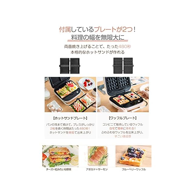 【両面焼き・タイマー付きで便利】タイマーをセットして待つだけ!上下両面にヒーターを搭載しているので、900W高出力のハイパワーで、ムラなく全体に火を通すことが出来ます。空の状態で、本体を5分程度予熱したら前準備は完了。ホットサンドの焼き上げ時間は3分程。セットして待つだけで、美味しいホットサンド/ワッフルを楽しめます、忙しい朝でも焼きすぎる心配はございません、美味しいホットサンドが完成します♪それに一度予熱した後、連続稼働で次々焼ける♪家族と一緒に楽しみましょう♪