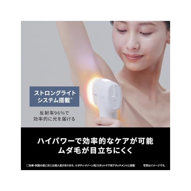 ストロングライトシステム搭載(※ボディ・Vゾーン用/スポットケア用アタッチメントに搭載※)。ハイパワーで太い毛も効果実感。
