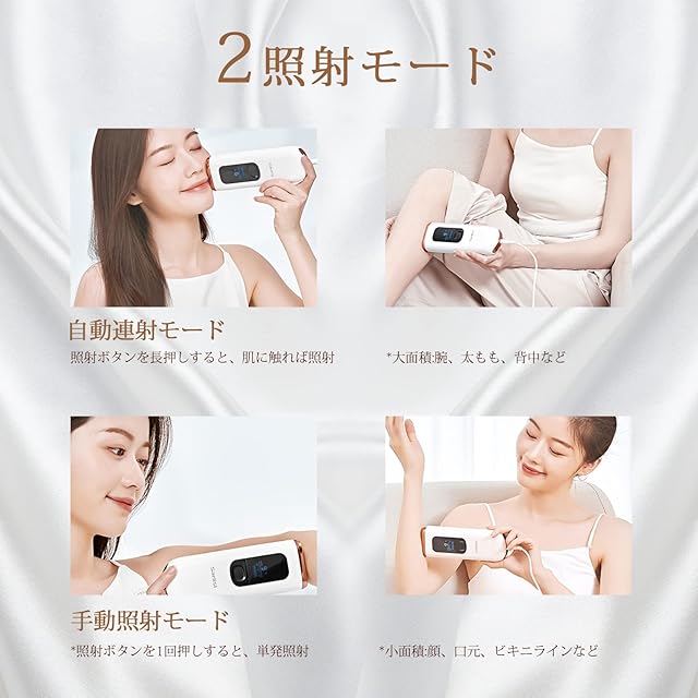【全身対応】全身適用な家庭用脱毛器です。手動と自動連続の2つのモードがあります。手動モードは、唇、指、脇の下、ビキニラインなどの狭い所に適しています。自動モードは、腕、足、腹部、背中などの広い所に適しています。VIO対応にも問題はない。