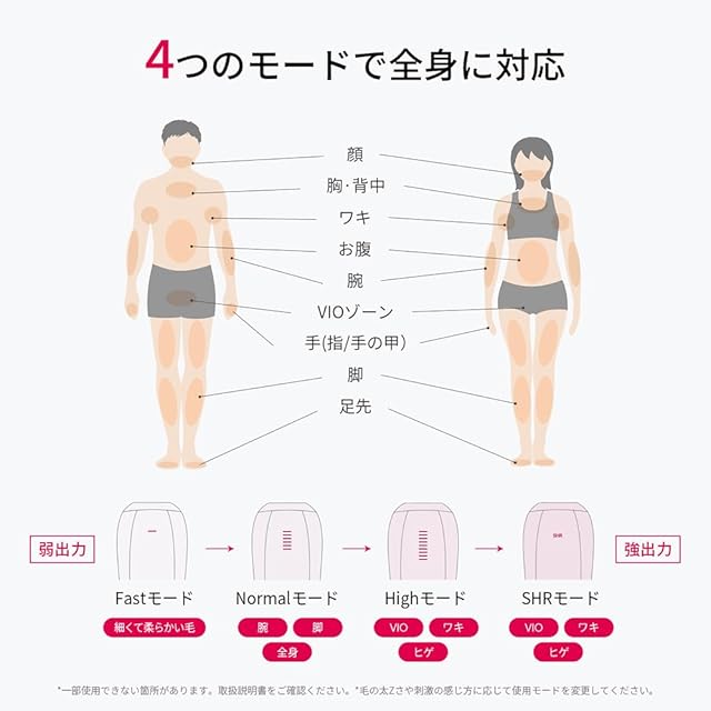 *1. トリートメントスケジュールに従って週3回使用した場合。効果には個人差及び部位差があります。 *2.当社の家庭用光美容器内で。SHRモードによる出力。 *3. 国際認証機関CVCによる試験結果。 *4.SHRモードは自動連続照射できません。 *5.国際認証機関CVCにて、160㎝の男女3名を対象とした試験結果。お手入れにかかる時間には個人差があります。 *6.痛みレスとは、痛みが少ないという意味です。痛みの感じ方には個人差があります。