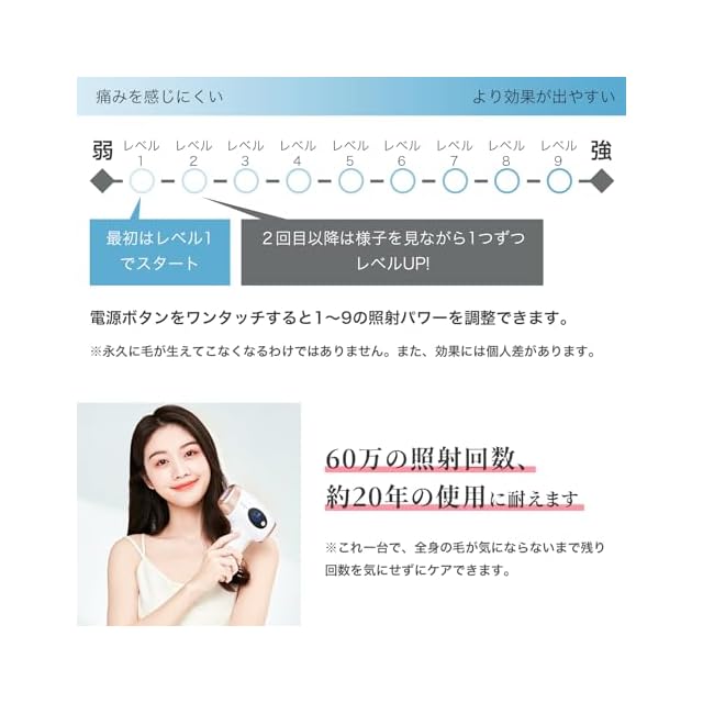 ❤九段階照射レベル:日本人の肌質を配慮して細かくな無駄毛ケアを9段階レベルで実現!使用部位や肌質によって、照射レベルが1~9調整できるので、ムダ毛ケア効率がアップ!自動や手動だと二つ照射モードが搭載し、狭い部位は手動モード、広い部位のほうは自動モードにして、部位によって使い分けを可能に、モードまでもこだわり!