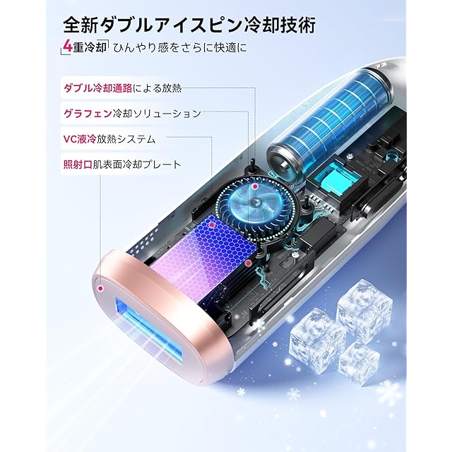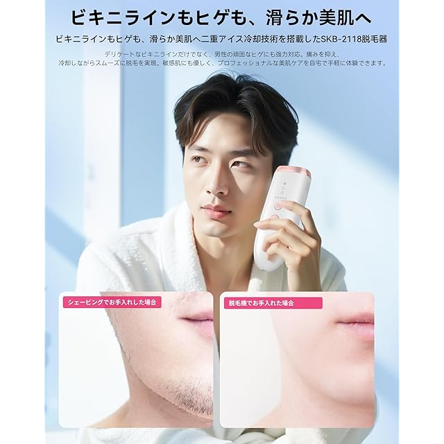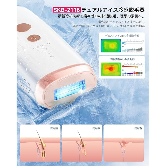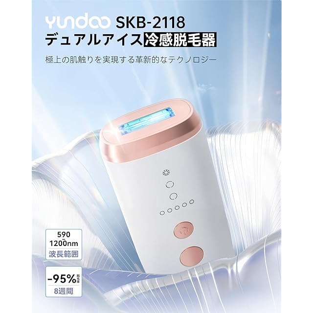 【新登場デュアルアイス冷感光脱毛器】YUNDOO冷感脱毛器SKB-2118は革新的な光脱毛器を開発され、自宅でも無痛にムダ毛ケア。最新のパルス光脱毛技術を採用し、波長範囲590-1200nm、ムダ毛ケアとスキンケアを同時に実現可能。実験により、4週間ぐらいは効果が見られ、8週間に脱毛率が96%に達し、滑らかな肌を得て、冷感無痛脱毛の効果を達成。