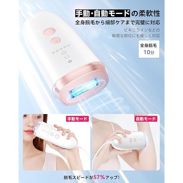 【最大能量20J●5段階照射レベルと手●自動モード搭載】YUNDOO社SKB-2118冷感脱毛器は1~5段階照射レベルを配備して、自分の肌色と毛タイプによってMIN6J~MAX18Jのエネルギーを調整して脱毛できる。(弱いレベルから徐々に強くレベルに調節するをお勧め。)照射部位に合わせて、脱毛モードを選択。連射モードでは腕や腿などの広範囲の部位でもストレスにならずに脱毛。手動モードは脇やビキニラインなど筋肉が薄い部位に適用。顔やVIOを含む、全身21ヶ所の脱毛がこれ1台で実現!初心者向けの簡単操作、詳しい日本語取扱説明書付き、操作簡単のボタンあり、初心者でも一目で分かり、自宅で楽々に脱毛を実現。