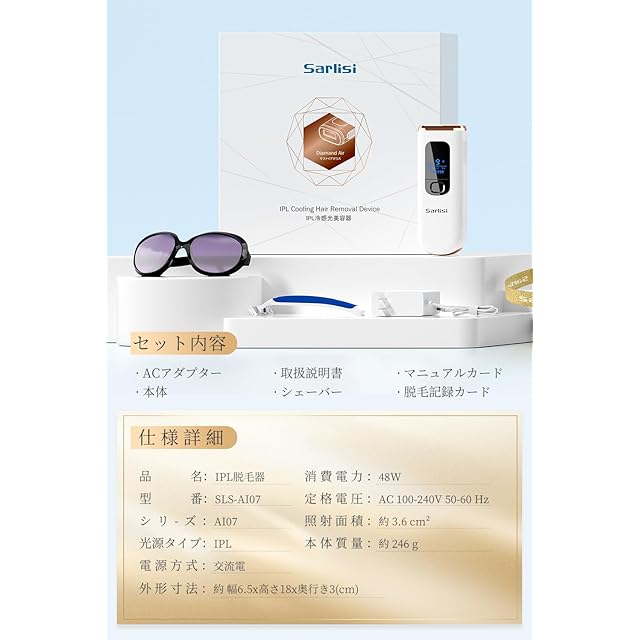 商品名:Sarlisi 脱毛器 全身脱毛 【新モデル】 冷感脱毛 IPL光脱毛器 家庭用 9段階調節 99万回照射 連続照射 光脱毛器 光エステ 男女兼用 だつもうきメンズ 髭 無痛脱毛 軽量 VIO対応 手動/自動モード 光美容器 Ai07-1