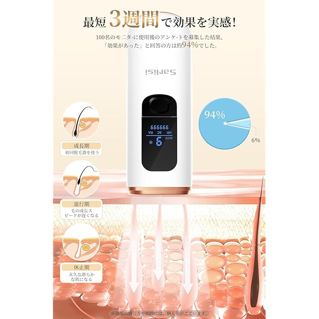 【最短4週間で効果を実感】IPLパルス光は特定の波長を利用し、毛包にあるメラニン色素にダメージを与えて、定期的に照射することで、体毛の成長が遅くなり、ムダ毛ケアが実現します。最短4週間で効果を実感。