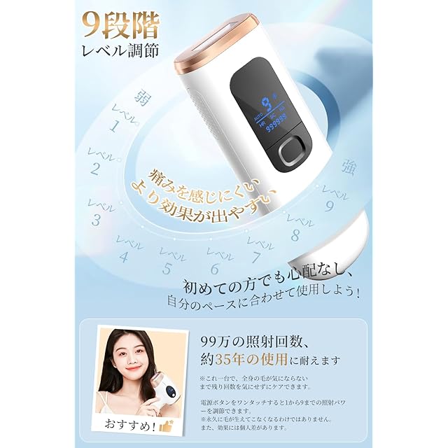 【新モデル登場】99万発ショット数!ご家族と1台で共用し、35年以上が使用できます。液晶ディスプレイを搭載し、設定中の機能やモードなどが一目瞭然。245g軽量設計のため、片手でも簡単操作でき、収納や持ち運びにも便利。