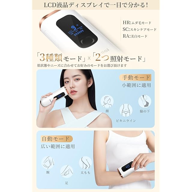 【全身対応】全身適用な家庭用脱毛器です。手動と自動連続の2つのモードがあります。手動モードは、唇、指、脇の下、ビキニラインなどの狭い所に適しています。自動モードは、腕、足、腹部、背中などの広い所に適しています。VIO対応にも問題はない。