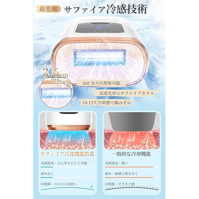 【無痛冷感脱毛を実現】冷却機能付き、急速に皮膚温度を下げ、脱毛しながら肌を冷やす仕組みで、お自宅でも痛くない快適な脱毛体験を与える。