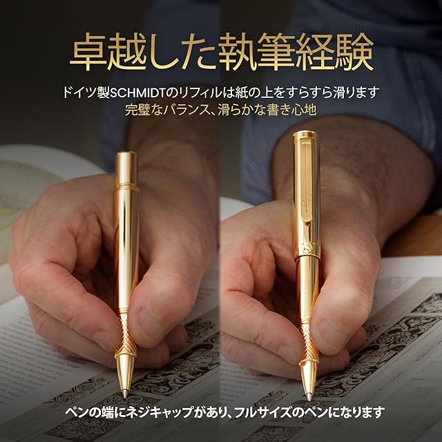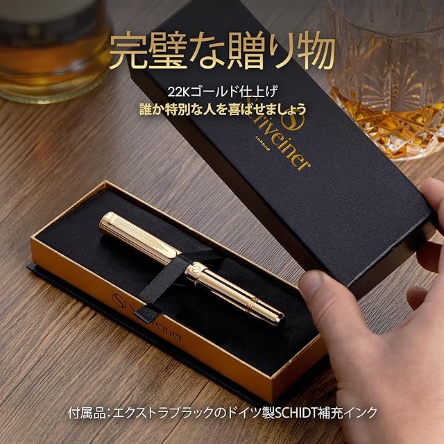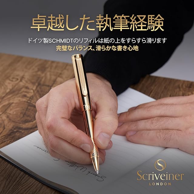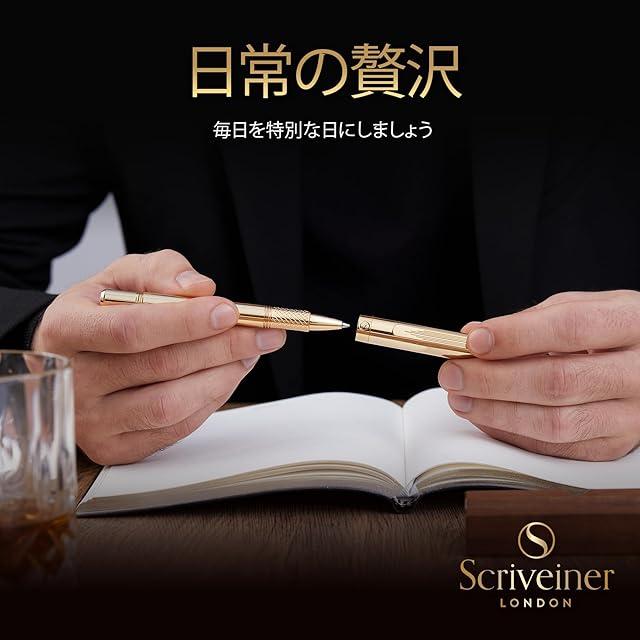 受賞歴のあるローラーボールペン<br><br>この重厚感のあるペンは、ソリッドブラス製で22Kゴールドメッキと22Kゴールドのアポイントメントが施され、その精密な工学は通常、何倍もの価格のペンにしか見られません。どんな環境でも印象的な存在となるでしょう。エグゼクティブのボードルーム、カフェ、旅先であっても、このペンは人の目を引くでしょう。<br><br>便利なサイズと完璧なバランス<br><br>バレルには両端にねじが加工されています。これにより、キャップをしっかりと閉じたりポストしたりできます。閉じた状態では、これはポケットに簡単に収まる小さなペンです。ポストした状態では、完璧なバランスのフルサイズのペンとなります。<br><br>素晴らしい書き心地<br><br>当社のペンはSchmidtの液体インクシステムを使用しています。これはジェルインクペンよりも優れており、ボールペンの便利さと万年筆のようなインクの感触を組み合わせています。滑らかな書き味を楽しんでいただけ、美しいペン字に最適です。<br><br>精緻なプレゼンテーションギフトボックス<br><br>ペンは美しいプレゼンテーションボックスに入っており、トレイの下には予備のリフィルが隠れています。記念日、クリスマス、誕生日プレゼント、あるいはシンプルに自身へのご褒美として、このペンを受け取る人はきっと喜ぶことでしょう。どんな機会にも最適な贈り物をお求めの方は、プレゼント探しのものがこれで終わりです!<br><br>商品に含まれるもの:<br><br>ローラーボールペン(キャップを含む重さ 52g / 1.8オンス) - シュミットのブラックリフィルが装着済み<br>プレゼンテーションギフトボックス<br>ペンのトレイの下に封入されたスペアのSchmidtブラックリフィル<br>カード<br><br>安心してご購入ください!<br><br>Scriveinerのペンを気に入っていただける自信があるため、2年間の交換を提供しています。ご購入時にペンを登録するだけです。また、初めての30日以内にペンをご返品希望の場合、全額返金をします。<br><br>今すぐカートに追加して、この素晴らしいペンをぜひご注文ください!