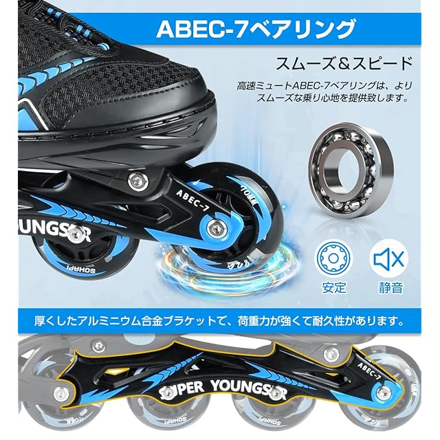 【安定性と静音性と耐久性と通気性と軽量】インラインスケートの表面高強度衝突の対策を講じ、衝撃吸収材を使用し、振動を防ぎ安定感があります。安全性と快適さを確保します。一列四つのスケートの構造で、実用範囲で最高の精度となっているABEC-7のベアリングを採用して、安全性が高くて、スムーズな体験も楽しめます。インラインスケートを順調に回ると同時に静音性も優れ、頑丈で耐久性100kg、摩擦抗性が少なく、耐久性に優れ、長時間使用しても大丈夫です。通気性抜群で 軽くて良い履き心地をお楽しみください。長時間練習しても、足首には負担がかかりません。