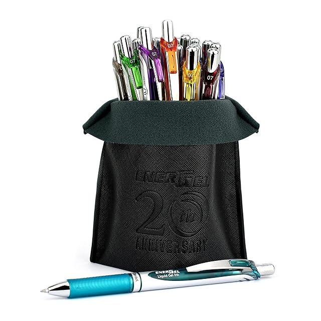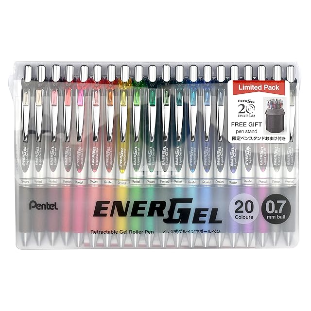 【特長】スッと書けてサッと乾く ゲルインキボールペン「エナージェル」の限定20色セットオリジナルポーチ付き