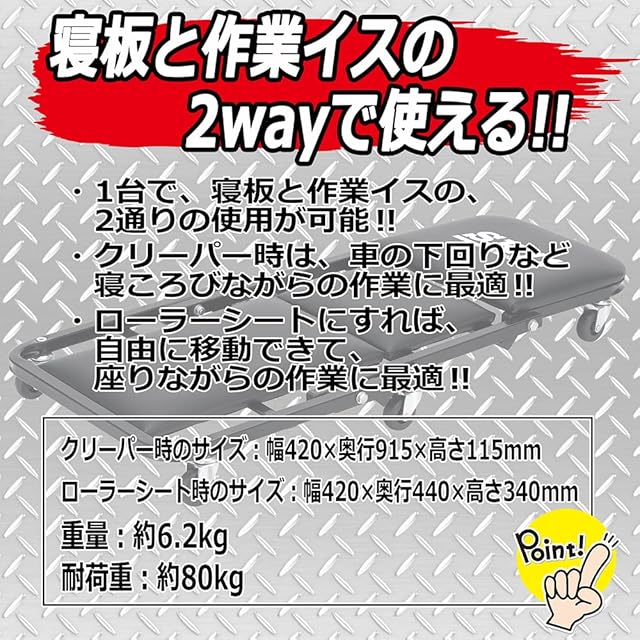 特徴:1台で、寝板と作業イスの2通りの使用が可能