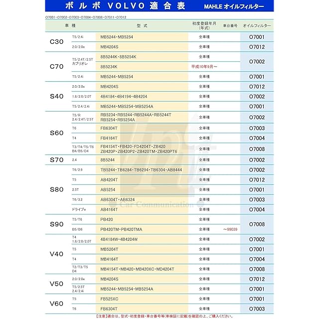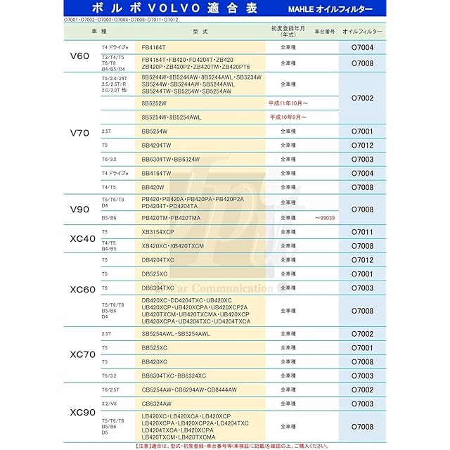 適合車種 : ボルボ : C70 : 型式 8B5244K/8B5254K・C70 : 型式 8B5234K 初度登録 平成10年9月以降・S40 : 型式 4B4184/4B4194/4B4204・S60 : 型式 RB5234/RB5244/RB5244A/RB5244T/RB5254/RB5254A・S70 : 型式 8B5244・S80 : 型式 TB5244/TB6284/TB6294/TB6304/AB8444・XC70 : 型式 SB5254AWL/SB5254AWL・XC90 : 型式 CB5254AW/CB6294AW/CB8444AW・V40 : 型式 4B4184W/4B4204W・V70 : 型式 8B5244W/8B5244AW/8B5244AWL/SB5234W/SB5244W/SB5244AW/SB5244AWL/SB5244TW/SB5254W/SB5254AW・V70 : 型式 8B5252W 初度登録 平成11年10月以降・V70 : 型式 8B5254W/8B5254AWL 初度登録 平成10年9月以降