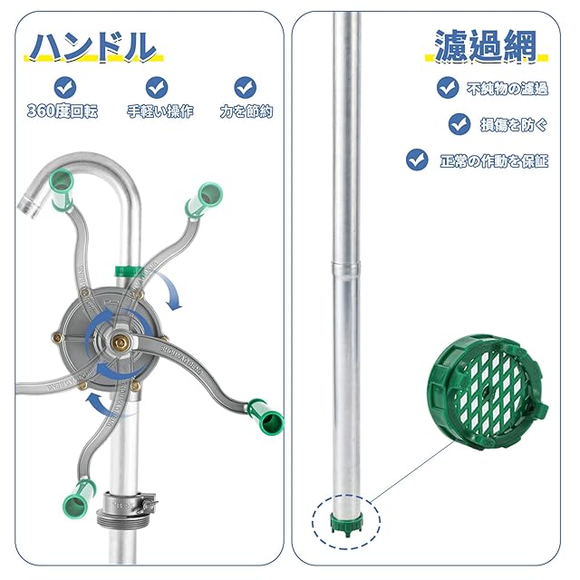 『底のろ過網設計』:オイル缶に不純物がある場合は、ろ過網設計で不純物をろ過でき、より精度が高いオイルを抽出できます。また、不純物はポンプ本体に入り、動作できなくなることを防止できます。もし不純物のサイズが小さい場合は、不純物がポンプ本体をブロックしないように、ろ過網にガーゼを付けることをお勧めいたします。