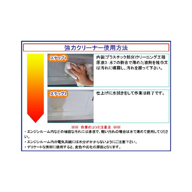 【注意事項】 量販店では手に入らない業務用商品の為、本商品ご使用の際は必ず目立たない部分で試してから作業を行い、使用用途を守ってお使い下さい。 その他、詳しくは商品に取扱説明書を同梱いたしますので、必ずよくお読みになってから作業を行なってください。