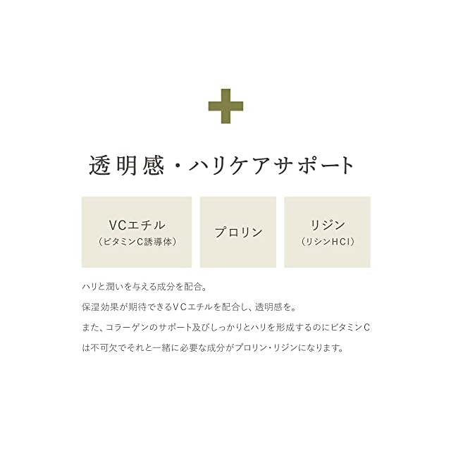 【ハリと透明感を与える成分を配合】保湿効果が期待できるVCエチルを追加配合し、透明感のある肌へ。また、コラーゲンのサポート及びしっかりと肌にハリを形成するのにビタミンCは不可欠でそれと一緒に必要な成分がプロリン・リジンになります。
