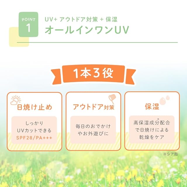 【1本3役のオールインワンUVミルク】 しっかりUVカットできる日焼け止め!毎日のおでかけやお外遊びにアウトドア対策!高保湿成分(シア脂)配合で日焼けによる乾燥を保湿ケア!