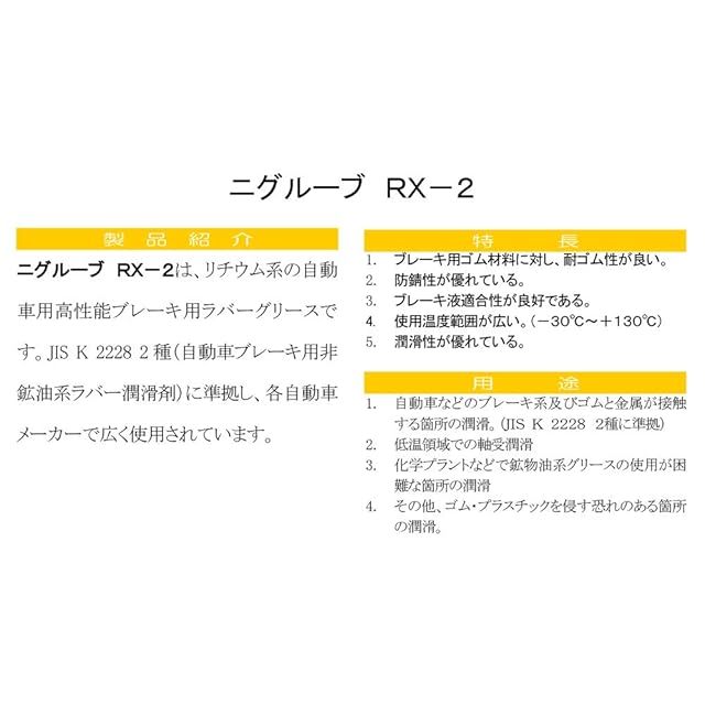 【製品紹介】ニグルーブ RX-2は、リチウム系自動車用高性能ブレーキ用ラバーグリースです。JIS K 2228 2種(自動車ブレーキ用非砿油系ラバー潤滑剤)準拠品。自動車メーカー7社で使用されている。