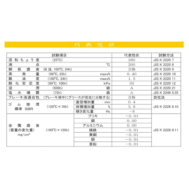 【用途】ブレーキ用ラバーグリース。自動車などのブレーキ系及びゴムと金属が接触する箇所(マスターシリンダー、ホイルシリンダーのゴムカップなどのゴムと金属の摺動部。ディスクブレーキ、レバーキャップ内の潤滑用)。低温領域での軸受け潤滑。化学プラントなどで鉱物油系グリースの使用が困難な箇所。軸受の潤滑にも適する。ゴム・プラスチックを侵す恐れのある箇所。