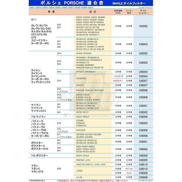 ポルシェ適合車種<br>【ケイマン ケイマンS ケイマンGTS (981 987) 型式 ABA-981MA122 ABA-981MA123 ABA-981DBX ABA-987MA120 ABA-987MA121 ABA-987MA121R】<br>【ボクスター ボクスターS ボクスターGTS (981 987) 型式 ABA-987MA120 ABA-987MA121 ABA-981MA122 ABA-981MA123】<br>【注意】適合は、型式等(車検証に記載)を確認の上、ご購入ください。<br><br>【セット内容】ポルシェ用のオイルフィルター『O8001』が2個セットです。<br>【フィルターサイズ】外径65mm 内径25mm 高さ141mm<br>【純正品番】0PB115466A, 0PB115499A, 9A110702400, 9A110722400<br><br> 『MAHLE (マーレ)』は、純正フィルター供給世界NO.1のフィルターメーカーオリジナルブランド!<br> MAHLEは世界最大級の純正サプライヤーです。<br><br> 世界各国に生産拠点を構え、幅広い製品群で約100年間自動車業界に貢献してまいりました。<br> MAHLEは世界一の純正供給実績を誇り、全製品純正同等の品質で、世界各国に支持されております。<br><br> ◆最高品質のオイルフィルター(オイルエレメント)<br> 『マーレ オイルフィルターの特徴』<br> ★汚染物質の混入を確実に防ぐ。<br> ★オイルグレードやエンジンの効率や性能を維持。<br> ★コールドスタート時の安定性を確保。<br> ★最大20バールのピーク負荷はハウジングの高圧抵抗によって相殺。<br> ★圧力リリーフバルブは、あらゆる条件下でオイルの供給を。<br> ★ノーリターンフローバルブはエンジンオフ時にフィルタの排出をストップ。<br> ★エンジンの始動時に適切なオイル供給を行います。<br><br> オイルフィルターが最大限の性能を発揮できるようにするためには、<br>自動車メーカーが定めたサービス間隔内に交換する必要があります。<br><br> 【注意】適合は、型式や初度登録年月等(車検証に記載)をご確認に上、ご購入ください。<br> ※適合が見つからない場合やご不明な点などありましたら、<br>車検証の「車台番号」「型式」「初度登録年月(年式)」を必ず添えてお問合せ下さい。<br>