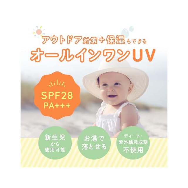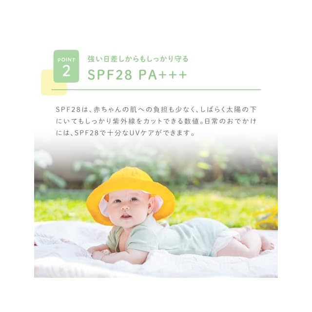 【強い日差しからもしっかり守るSPF28+++】赤ちゃんの肌への負担も少なく、しばらく太陽の下にいてもしっかり紫外線をカットできる数値。日常のおでかけには、SPF28 で十分なUVケアができます。