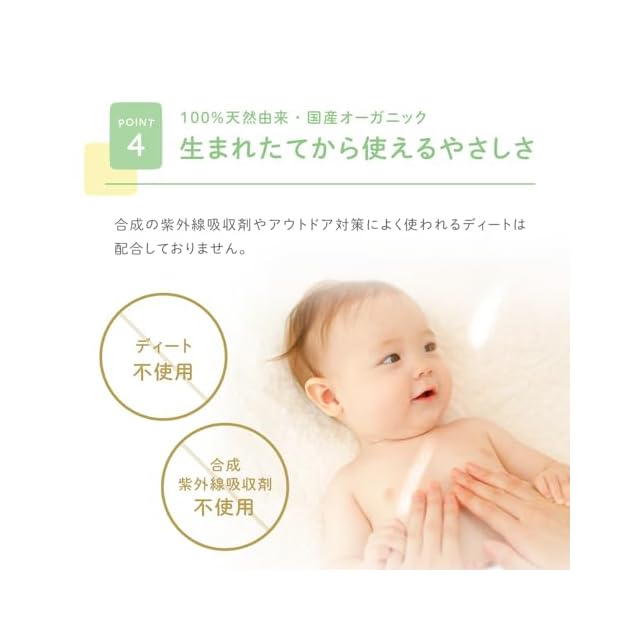 【100%天然由来・国産オーガニック】合成の紫外線吸収剤やアウトドア対策によく使われるディートは配合しておりません。こだわりの処方で赤ちゃんへの負担を軽減しています。