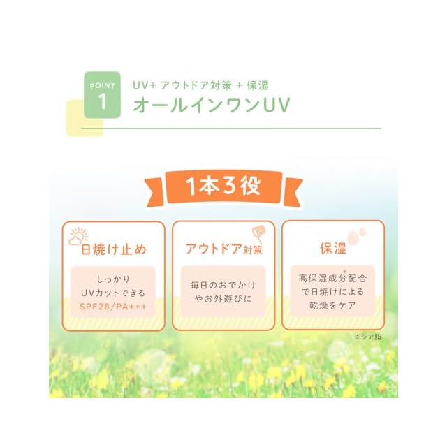 【1本3役のオールインワンUVミルク】 しっかりUVカットできる日焼け止め!毎日のおでかけやお外遊びにアウトドア対策!高保湿成分(シア脂)配合で日焼けによる乾燥を保湿ケア!