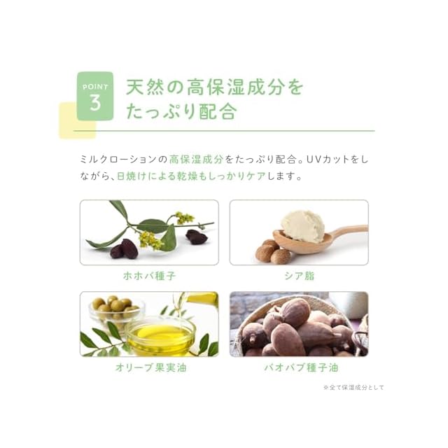 【天然の高保湿成分をたっぷり配合】ミルクローションと同じ高保湿成分をたっぷり配合。UVカットをしながら、日焼け止めによる乾燥をしっかりケアします。