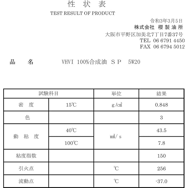 【粘 度】 SAE:5W-20