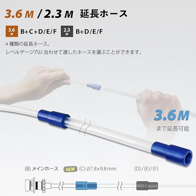 【エンジンオイルホース】4本のエンジンオイルホースが付き、一番細いのは内径3.5x外径4.5mmのサイズで、ほとんどの車のレベルゲージに対応できます。 ホースとホースを繋げると2メートルになり、一番底のオイルまで簡単に吸い出せます。