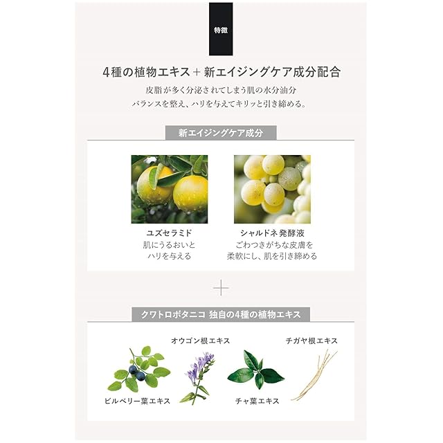 【オイリー肌のエイジングケアローション】洗顔後、この一本でテカリ・べたつきを抑える「皮脂ケア」と、ハリを与えて肌を引き締める「エイジングケア」の両方に対応。肌にうるおいを与える化粧水、美容液成分を届ける美容液、うるおいを閉じ込める乳液の役割を果たすオールインワン化粧水です。