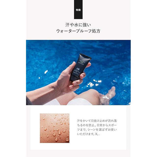 【水や汗に強いウォータープルーフ】ゴルフ、キャンプ、ビーチ、プールなどアウトドアを楽しむ方にも日焼け止めが流れ出さないウォータープルーフ処方。しかも、石鹸や洗顔料で簡単に落とせるので、クレンジングを使わない男性でも手軽に日常使いをしていただけるメンズ日焼け止めクリームです。