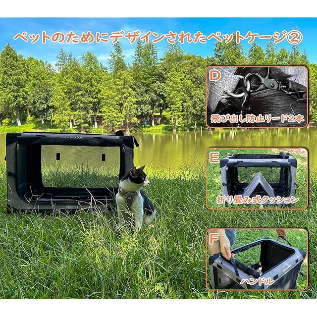 【ペット思いのデザイン】:①4面出入口には通気性の良いメッシュが使用されており、暑くなったり蒸れたりすることがなく、またペットの様子を確認できるため安心です。②ロック付きジッパーで安全面もばっちりです。③底部にはクッションが備わっており、長旅でも快適です。④取り外し可能なカバーで丸洗いも可能です。⑤側面のポケットにはおやつや小物を収納できます。⑥中に飛び出し防止リードが付属しており、より安全に使用できます。