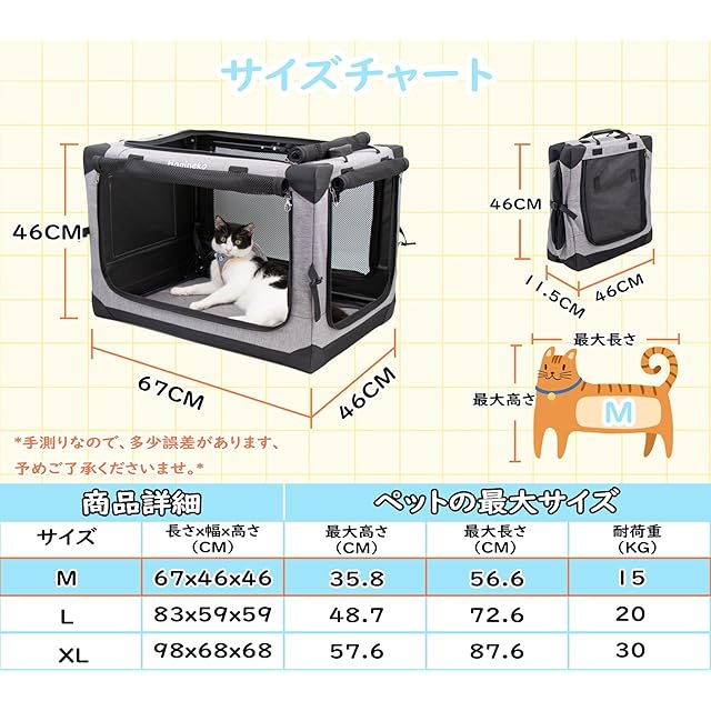 【サイズと素材】:Mサイズ展開時:長67cm×幅46cm×高46cm;収納時:長46cm×幅46cm×高12cm。素材は600D防水オックスフォード、メッシュ部分はナイロン製、フレームは鉄製で耐荷重15kgまで対応可能です。カバーは取り外し可能で洗濯機で洗えるので、ペットの健康を守れます。