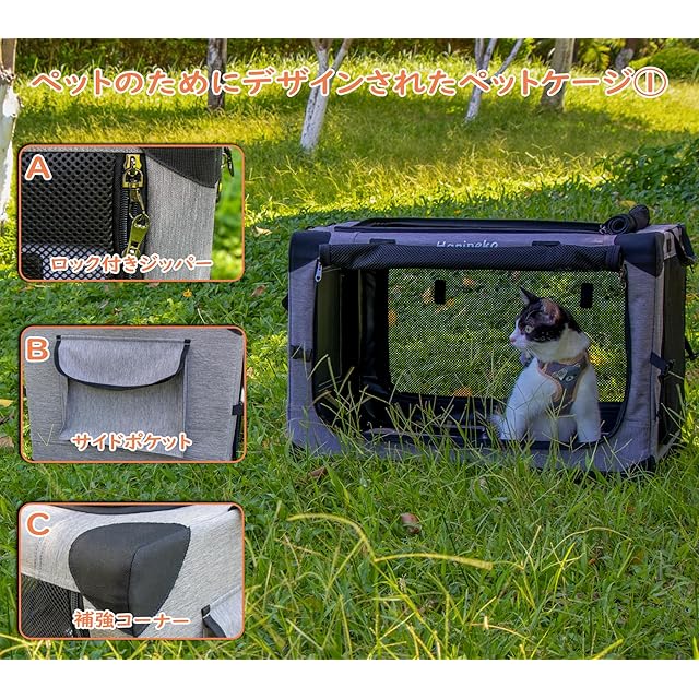 【ペット思いのデザイン】:①4面出入口には通気性の良いメッシュが使用されており、暑くなったり蒸れたりすることがなく、またペットの様子を確認できるため安心です。②ロック付きジッパーで安全面もばっちりです。③底部にはクッションが備わっており、長旅でも快適です。④取り外し可能なカバーで丸洗いも可能です。⑤側面のポケットにはおやつや小物を収納できます。⑥中に飛び出し防止リードが付属しており、より安全に使用できます。