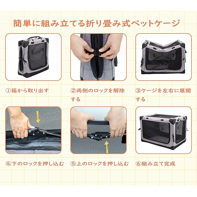 【新型ペットクレート】:独特な折りたたみ式デザインで、4つのバックルを締めたり解除したりするだけで簡単に取り付け・保管できます。他のペットクレートやコンテナと比較して、軽量かつ持ち運びが簡単で工具不要で組み立ても数秒で完了します。「市販のコンテナより30%以上省スペースです。」