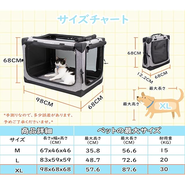 【サイズと素材】:XLサイズ展開時:長98cm×幅68cm×高68cm;収納時:長68cm×幅68cm×高12.2cm。素材は600D防水オックスフォード、メッシュ部分はナイロン製、フレームは鉄製で耐荷重15kgまで対応可能です。カバーは取り外し可能で洗濯機で洗えるので、ペットの健康を守れます。