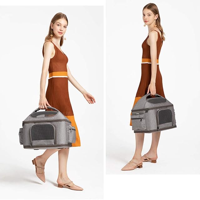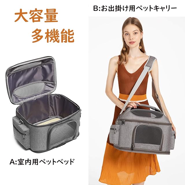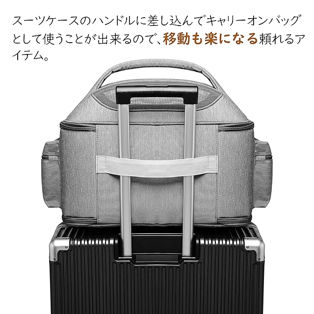 「3WAYペットキャリー」①肩掛けできるショルダーベルト付きです。(ポケットに入っております。)②丈夫持ちやすい柔らかな持ち手付き、肩掛けでも、手持ちでも痛くなりにくいです。③スーツケースのハンドル部分にセットすればキャリーオンバッグに早変わり、移動も楽になる頼れるアイテム。