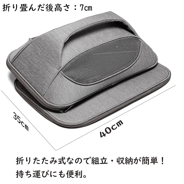 「いつものハウスで」ペットの様子が外から見えるメッシュ窓があり、また風通しがいいのでハウスとして使用することが出来ます。天井はファスナーで開閉なのでワンちゃんやニャンコを抱っこしながらの出し入れがスムーズ。正面扉を開ければ自由に出入りできます。ふかふかの中敷きも付き、おうちやお出かけ先でもベッドとしてお使いいただけます。